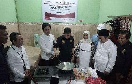 Menteri Energi dan Sumber Daya Mineral (ESDM) Ignasius Jonan mencoba memasak dengan gas yang sudah teralir ke rumah warga