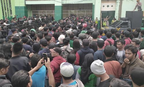 Terlihat ribuan Bonek terlihat antre di pintu loket dari sisi selatan dan utara. Karena loket belum dibuka mereka antre hanya duduk berjejer di depan Gelora Delta Sidoarjo.