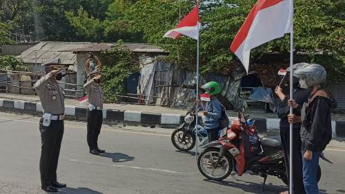 KAMPUNGBERITA.ID – Bertepatan dengan detik-detik Proklamasi di Hari Kemerdekaan RI ke-76 yang jatuh pada Selasa 17 Agustus 2021, sejumlah pengendara kendaraan bermotor yang melintas di Bundaran Dolog, Jl Ahmad Yani diminta berhenti sejenak.