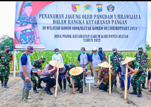 KAMPUNGBERITA.ID-Pangdam V/Brawijaya Mayjen TNI, Nurchahyanto melakukan penanaman bibit jagung dalam rangka menciptakan ketahanan pangan di Desa Pojok, Kecamatan Garum, Kabupaten Blitar, Kamis, (14/7/2022).