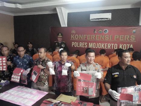 Polresta Mojokerto saat rilis barang bukti dan tersangka kasus narkotika.@KBID2020