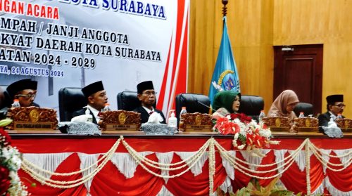 KAMPUNGBERITA.ID-Sebanyak 50 anggota DPRD Kota Surabaya hasil Pileg 2024 dari 10 partai politik, resmi dilantik di ruang rapat utama DPRD Kota Surabaya, Sabtu (24/8/2024).