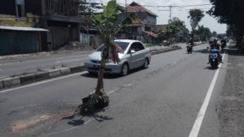 Penancapan pohon pisang ini sebagai tanda bahaya akibat kerusakan jalan yang tak lebih sebagai anak tiri pasca beroperasinya tol Surabaya-Mojokerto.