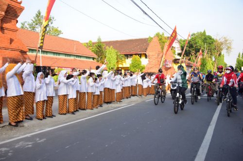 Selain itu, di tengah-tengah perjalanan gowes, Gubernur Khofifah juga berkesempatan menyapa para siswa yang berjejer rapi di depan sekolah dengan mengunakan pakaian kebaya khas Mojokerto.