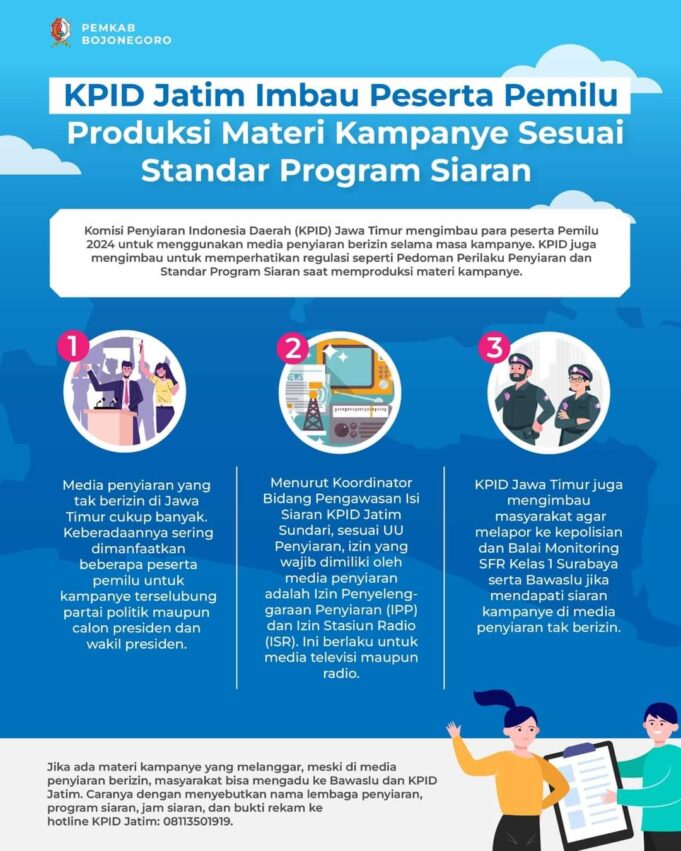 KAMPUNGBERITA.ID – Komisi Penyiaran Indonesia Daerah (KPID) Jawa Timur mengimbau para peserta Pemilu 2024 untuk menggunakan media penyiaran berizin selama masa kampanye. KPID juga mengimbau untuk memperhatikan regulasi seperti Pedoman Perilaku Penyiaran dan Standar Program Siaran saat memproduksi materi kampanye.