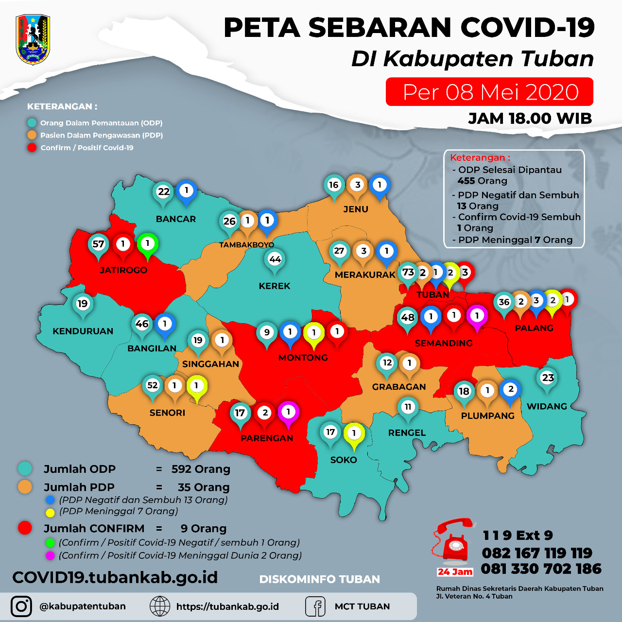 Berdasarkan data peta sebaran Covid-19 Kabupaten Tuban, per tgl 08/5/2020 hingga pukul 18.00 WIB terjadi penambahan Orang Dalam Pemantauan (ODP) baru 9 orang. Sehingga jumlah kumulatif ODP sebanyak 592 orang dengan keterangan sebanyak 455 orang selesai pemantauan dan 137 orang masih dalam pemantauan.