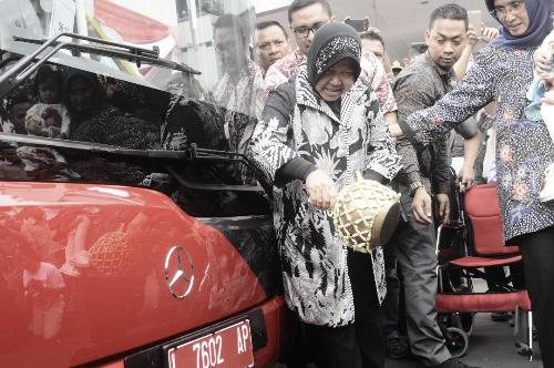 Risma memecah kendi ke body Bus Suroboyo pertanda mulai dioperasikan
