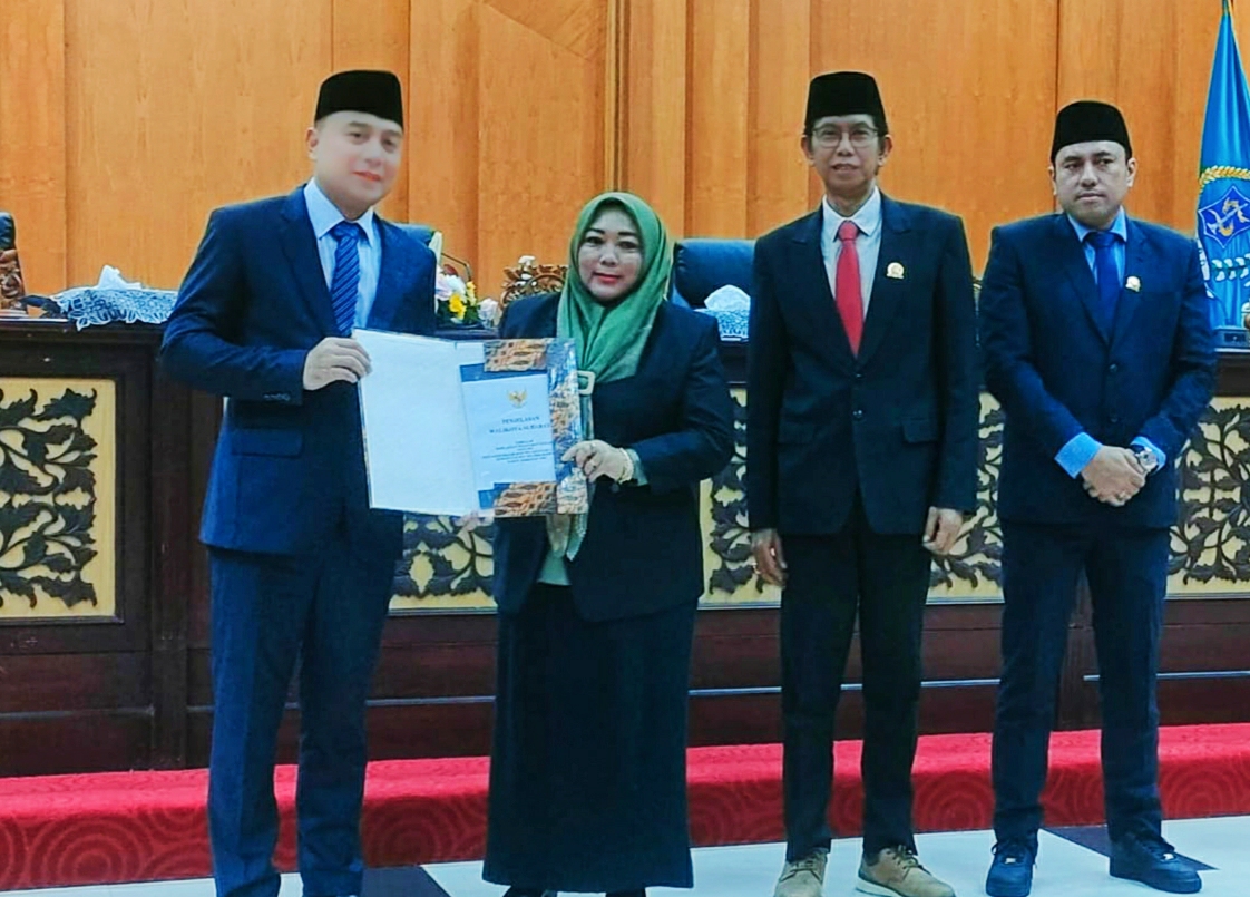 Wali Kota Surabaya, Eri Cahyadi menyerahkan dokumen jawaban Wali Kota atas pandangan umum fraksi-fraksi terkait Raperda tentang KBS dan RPJMD kepada pimpinan DPRD Surabaya.@KBID-2025.
